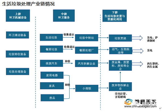 生活垃圾产业链包括上游环卫机械设备、中游生活垃圾收集运输和下游生活垃圾处置与资源化利用。