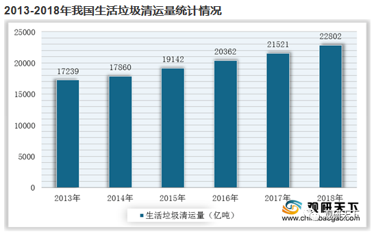不过,随着国家相关部门及各城市近几年纷纷加大治理力度,加强对生活垃圾清运力度,我国生活垃圾清运量不断提升。根据数据显示,2018年全国城市生活垃圾清运量22802万吨,同比增长6%。