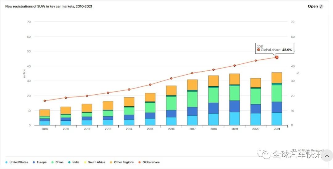 纵观整个新冠疫情期间,全球SUV的销量依然很强。2020-2021年间,全球SUV的销量增幅逾10%。而在2021年,SUV在全球汽车销量中的占比在45%以上——不论是销量还是市场份额,均再创新高。
